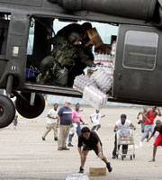 A military helicopter makes a food and water drop to hurricane survivors near the convention center.