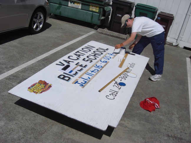 Jennifer Land paint the VBS sign in preparation