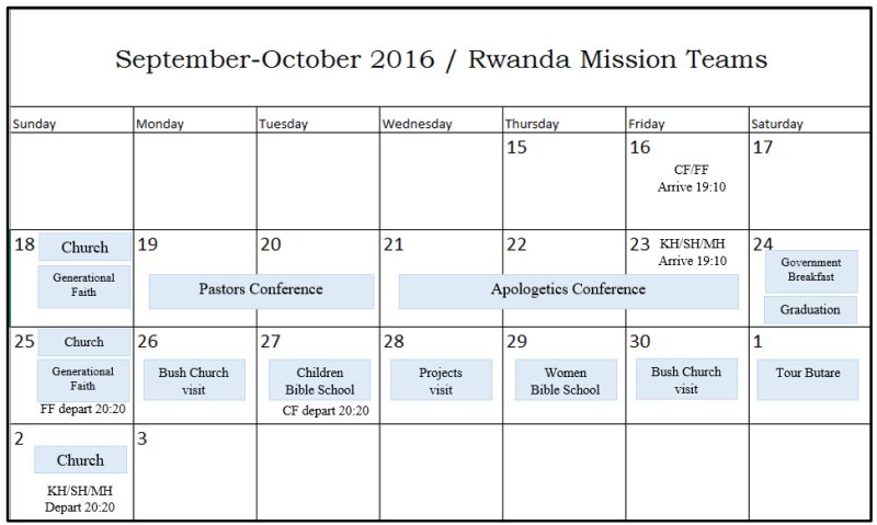 As you can see, it a very full schedule. So I’ve put together a prayer schedule for whoever feels led to bring us before the Lord so that we can accomplish only what He wills. God’s Spirit is moving in powerful ways in Africa. Whenever we go to Rwanda, we rejoice and are encouraged by the demonstrations of His power. Our hearts’ desires are to help our African brothers harness that power and to direct it only to the glory of God.