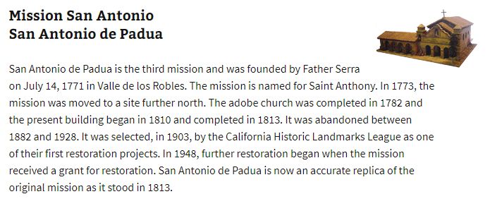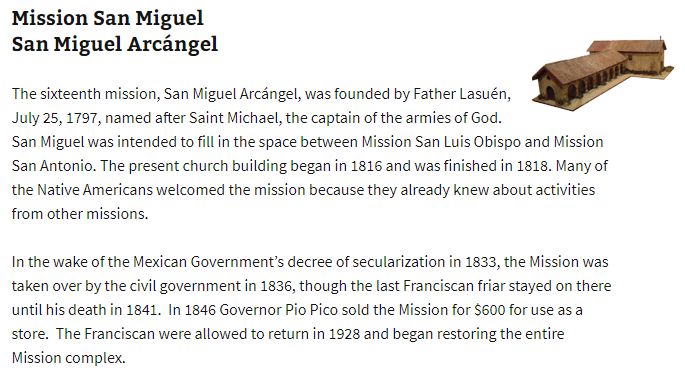 San Antonio de Paduo, and San Miguel Archangel, spending the night at Camp SLO.