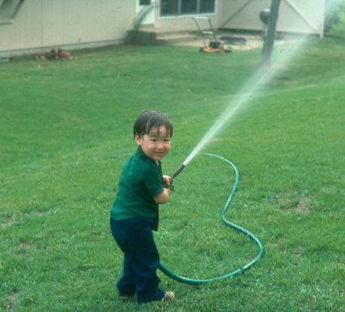 Zachary hosing down the back yard Dad and son dressed up