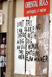 Rug business owner Bob Ru stands in the doorway next to his makeshift warning sign for looters. Five days after Katrina, a walk through New Orleans has become a walk through hell.