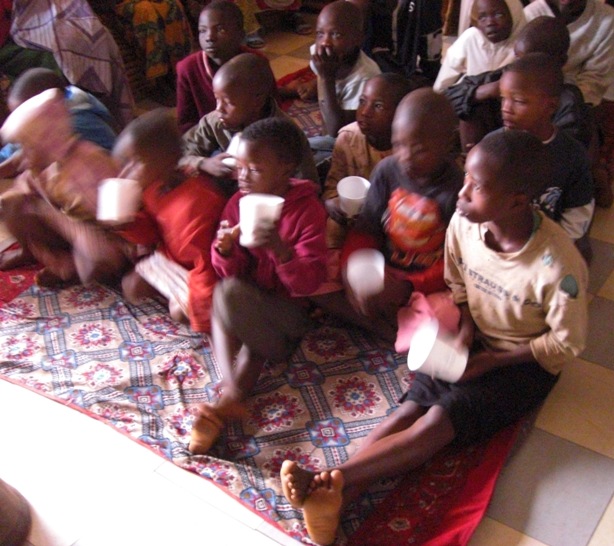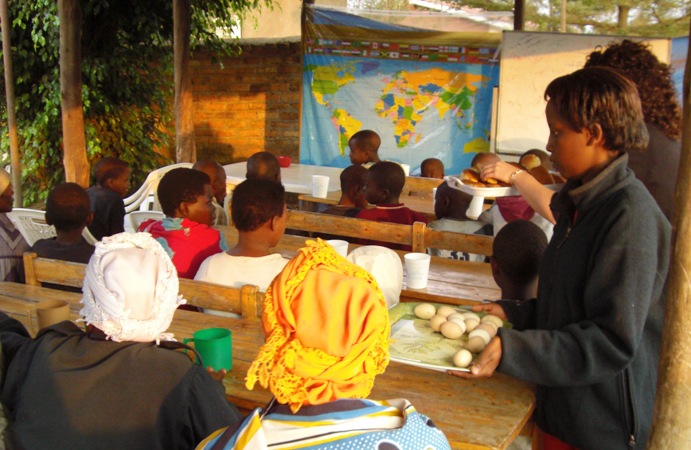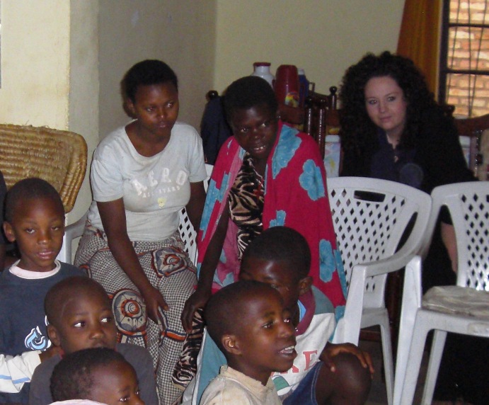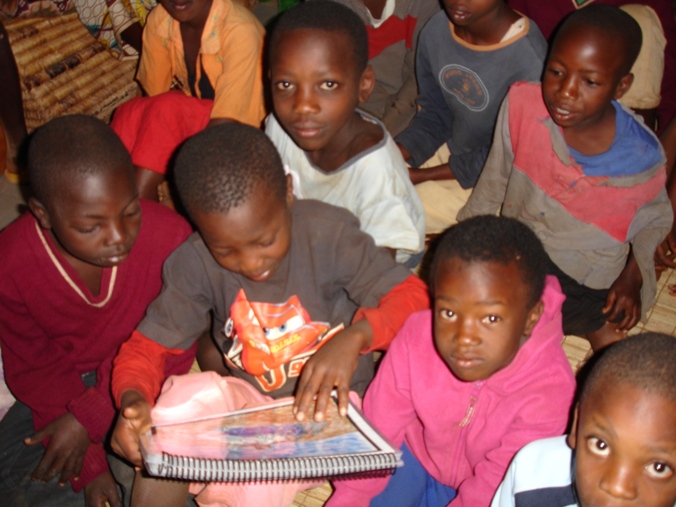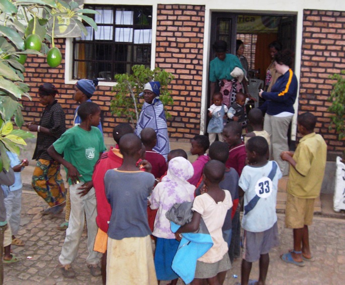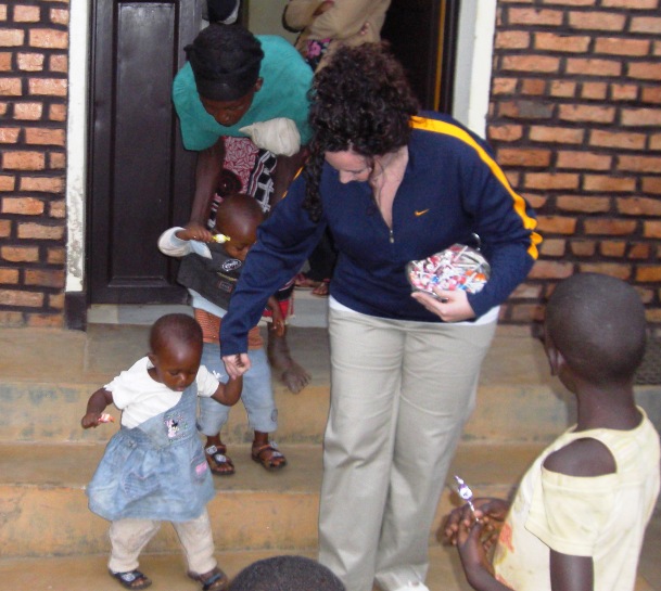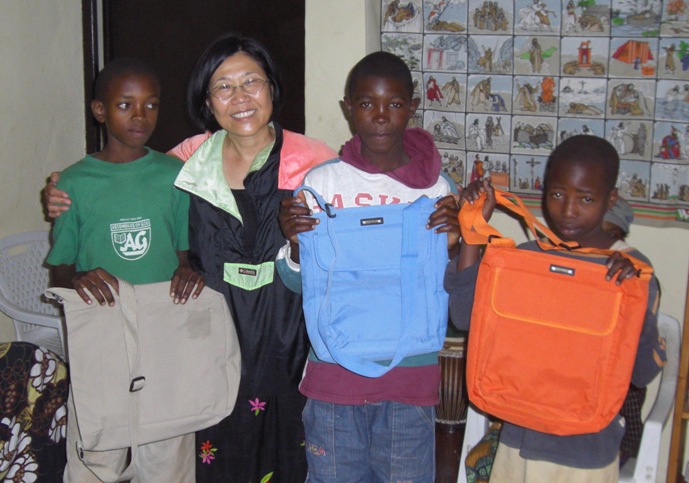 Kim passing out backpacks to special children