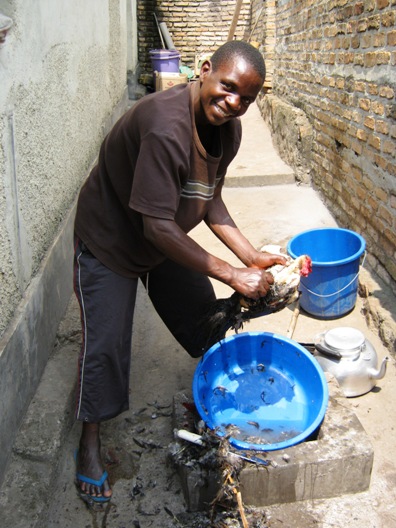 Jack plucking the chicken for Kim's last meal