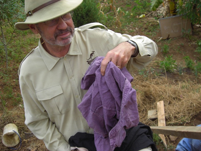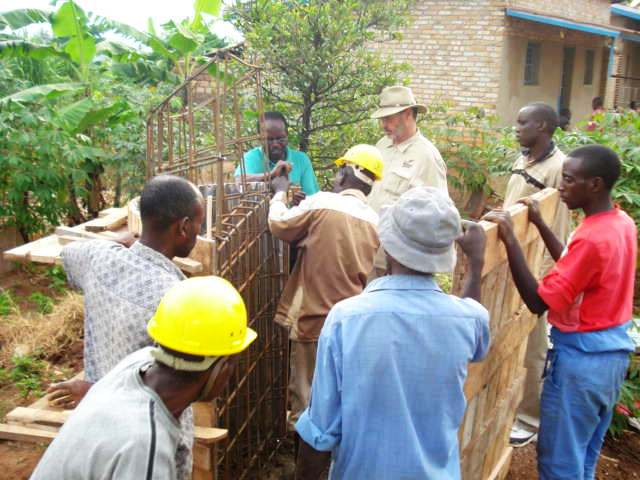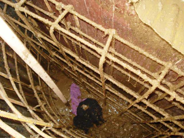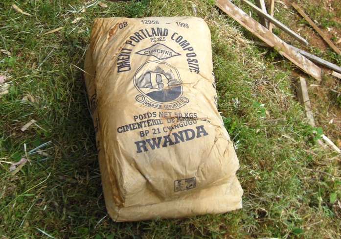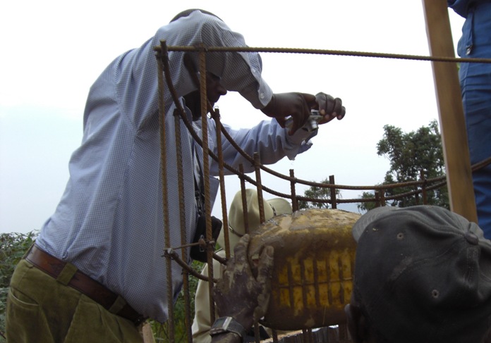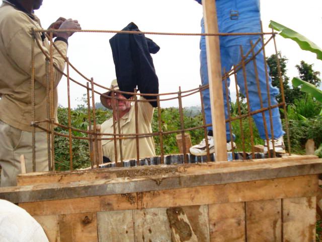 He drops them into the center of the cement mix