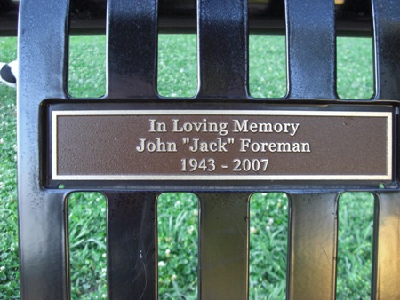 On our morning walk, Jody and I stopped off at the park bench memorializing my brother Jack