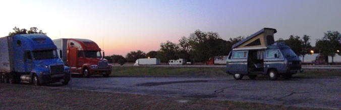 Zachary and I were tired, so we stopped at a Rest Area just east of Fort Stockton at about 1am. This was our only non-camping overnight stop -- parked next to a big-rig