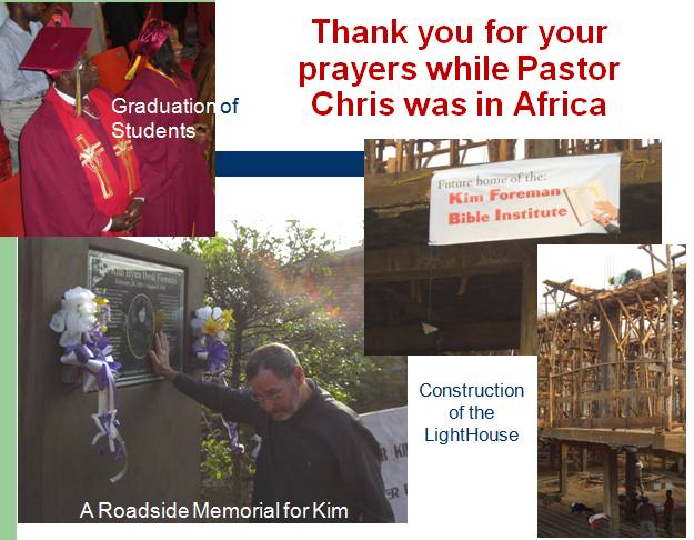 After much prayer and seeking the wisdom from above, I have decided to retire as your pastor effective August 31, 2012. After this retirement I plan to relocate to Rwanda and lead the Kim Foreman Bible Institute.