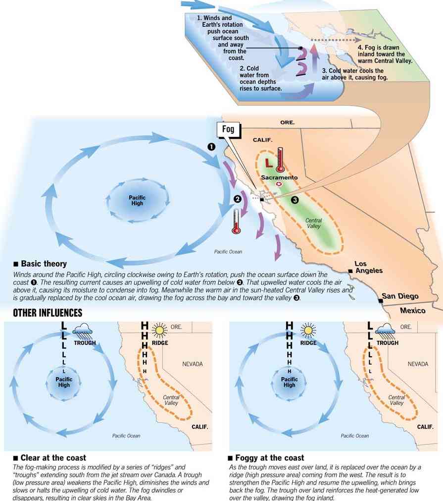 HOW BAY AREA FOG FORMSSummer fog is as characteristic of San Francisco as sourdough and cable cars. At the simplest level, it can be explained as the result of hot air in the Central Valley and cool ocean currents offshore. But scientists are learning that it is also influenced by more complex global weather forces. 1. Winds and Earth's rotation push ocean surface south and away from the coast. 2. Cold water from ocean depths rises to surface. 3. Cold water cools the air above it, causing fog. 4. Fog is drawn inland toward the warm Central Valley. -- Basic theory Winds around the Pacific High, circling clockwise owing to the Earth's rotation, push the ocean surface down the coast 1. The resulting current causes an upwelling of cold water from below 2. That upwelled water cools the air above it, causing its moisture to condense into fog. Meanwhile the warm air in the sun-heated Central Valley rises and is gradually replaced by the cool ocean air, drawing the fog across the bay and toward the valley 3. OTHER INFLUENCES-- Clear at the coast The fog-making process is modified by a series of ``ridges'' and ``troughs'' extending south from the jet stream over Canada. A trough (low pressure area) weakens the Pacific High, diminishes the winds and slows or halts the upwelling of cold water. The fog dwindles or disappears, resulting in clear skies in the Bay Area. --Foggy at the coast As the trough moves east over land, it is replaced