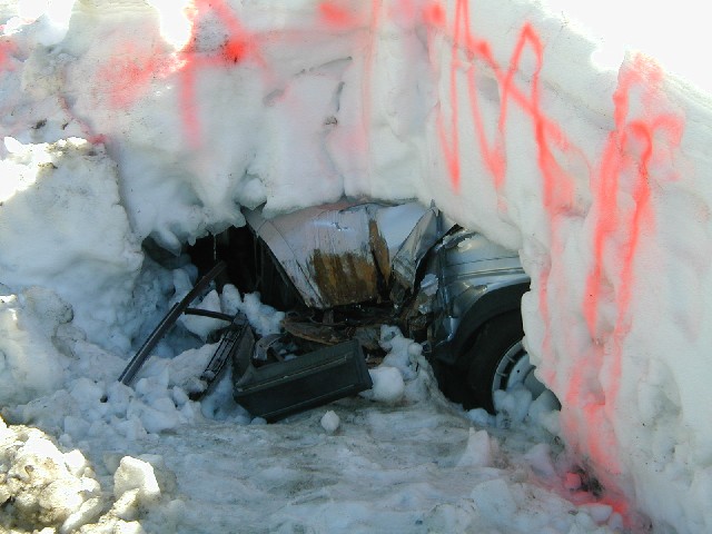A snowplow hit this poor car