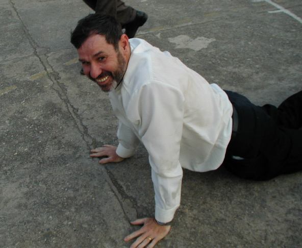 Chris guarded David too closely and fell to the concrete