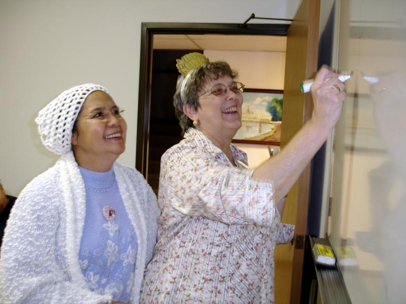 Linda writes with Sita looking on