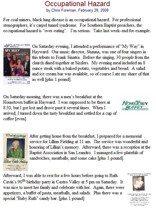 A Triple HeaderKim and I have been celebrating our anniversary on March 23 for thirty-four years. (Yes, I know. I m a lucky guy.) I have been a participant in Easter celebrations for my entire life that equals 58 Easters. (Yes, I know. I m a lucky old guy). But something strange happened last Sunday something wonderful. We celebrated our anniversary and Easter on the very same day! I didn t realize this coincidence until I ripped FEBRUARY off my office calendar and circled my anniversary date. Sunday, March 23, 2008 would be a double-header. March 23 is a very early date for Easter. As a matter of fact, the last time Resurrection Day fell on March 23 was in 1913, a few years before my parents were born. Unlike the rest of our holidays, Easter does not stay put, but hops around like an Easter bunny. That s because, the resurrection of Jesus is celebrated on the first Sunday after the first full moon (Paschal Full Moon) after the first day of Spring (Vernal Equinox). In 2008 those three days were stacked one after the other. But this Easter/Anniversary was even more special because I was blessed to baptize three believers in Christ. So for me this made March 23 not a double-header, but a triple-header. I baptized new believers, then I preached an Easter sermon, then I presented my wife with 34 roses. It was a good day all around. I wanted to calculate the next time of my anniversary and Easter would fall on the same date. It turns out to be the year of our Lord 2160. By my reckoning that would be our 186th wedding anniversary. My common sense tells me that Kim and I won t be around on earth to celebrate that day. However, my sense of faith tells me that in 2160, Kim and I will exist in a realm where we will recognize one another. Maybe we will even share memories of the Easter/Anniversary that occurred 152 years earlier. It s worth waiting to see. | |||||||||||||||||||||||||||||||||