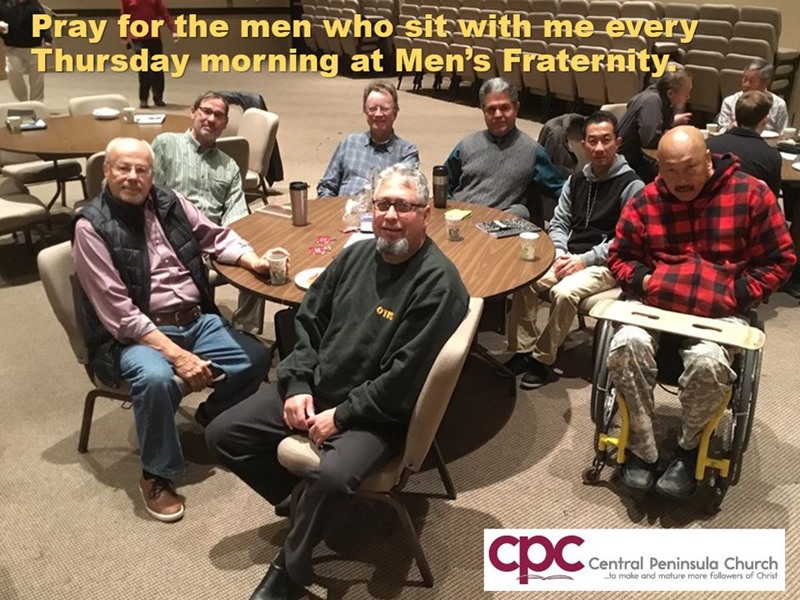 Liz and I attend Central Penninsula Church usually the 9:00 service. I currently lead a table at Men's Fraternity at on Thursday morning. We meet at Central Peninsula Church at 6:00 am.