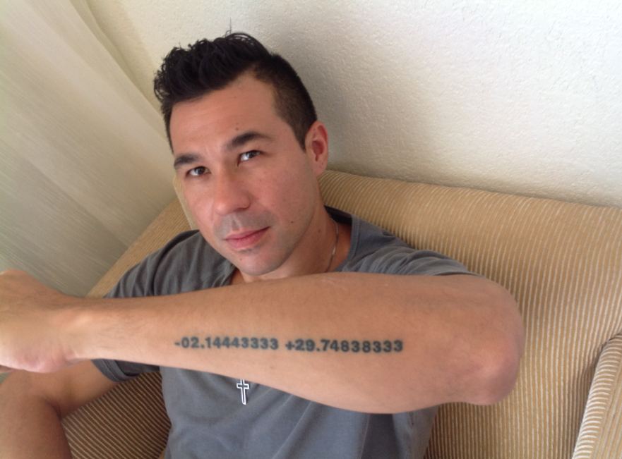 Click for a view from the balcony Simon shows his latest tattoo coordinates of his mom's memorial in Rwanda