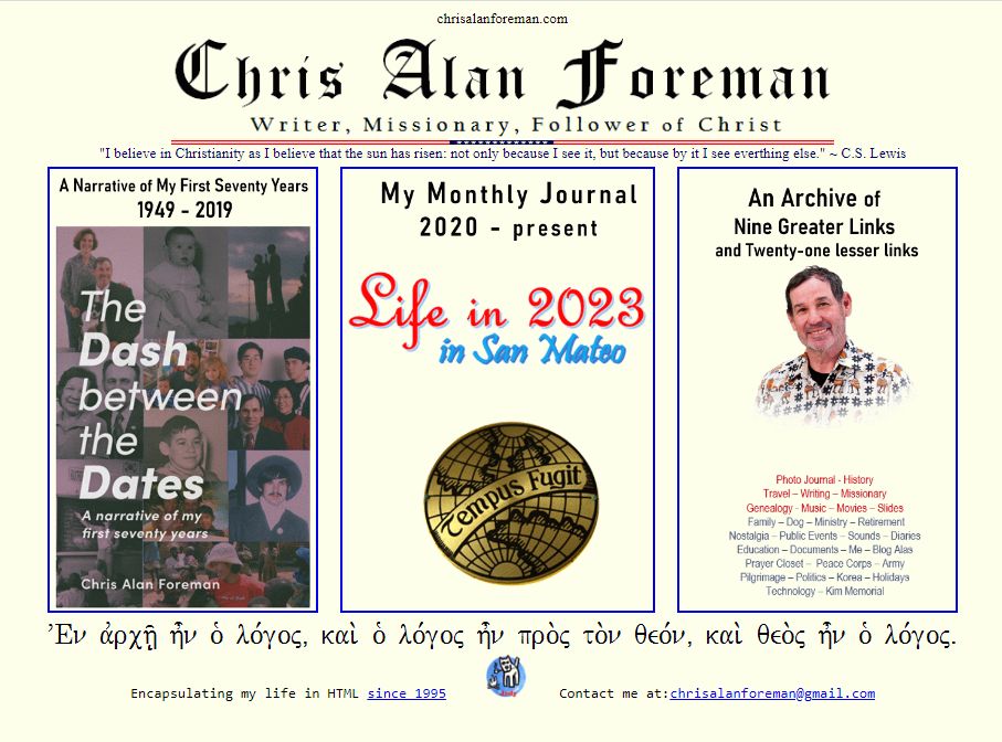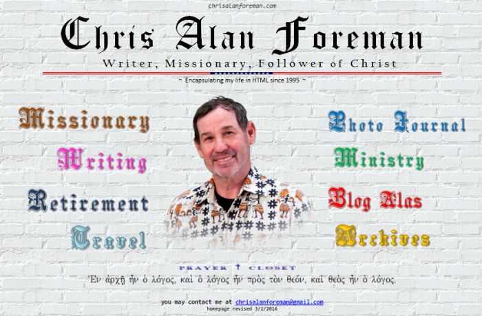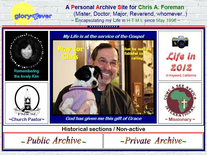 This is my 10th site started in August 2003. This was a major overhaul. After not changing much for over two years, I really changed the archetecture. I had so many pictures and personal things on the site that I wanted it to be half PRIVATE (password protected) and half PUBLIC (non-password protected). Also, I was at long last launching my late-in-life carreer as a pastor. It has been a few months since I began this new site and still I troll my way through it to fix broken links and images. I do hope that I won't make major changes for a long while.I switched to 1and1 as an internet provider in November, 2004. |