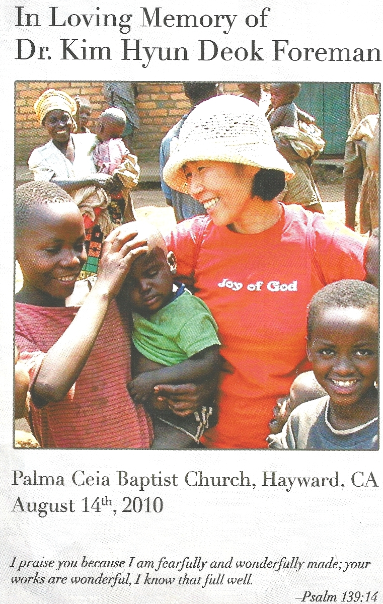 “Kim’s life was cut short; Yet in the years God gave her, she accomplished much because she loved much. I have no doubt that Kim Hyun Deok will hear those words spoken by her heavenly Father, ‘Well done, good and faithful servant! You have been faithful with a few things; I will put you in charge of many things. Come and share your master's happiness!”23