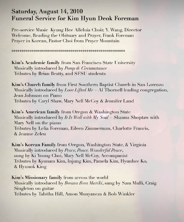 The funeral service began at nine with choral music by the Alleluia Choir. By nine fifteen the church was filled with about four hundred people. The extended program called for six groups of Kim’s family to take the platform and speak tributes.