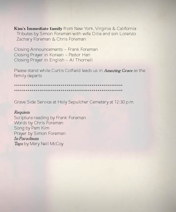 After my tribute, there were benedictions in English and in Korean. Then the family departed, as the congregation sang “Amazing Grace.”