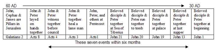 ConclusionThere are seven references in the Fourth Gospel to the anonymous/beloved/other disciple. In six of these seven references the anonymous disciple is coupled with Simon Peter. In the seventh appearance, the beloved disciple appears alone with three women. In the Acts of the Apostles there are four references to the Apostle John. At first mention, Peter and John are listed as members of the eleven disciples. In the three subsequent occurrences, John is coupled with Simon Peter. They appear to minister as a "twosome". The Apostle John appears one further time in narrative. In the book of Galatians, John is again coupled with Peter; this time as part of a trio with James the brother of Jesus. What can we conclude from these scriptural observations? We can conclude probably what the earliest readers of the Fourth Gospel concluded. I believe that our vision becomes clearer when we look backward from the prospective of 100 AD, rather than look forward from the start of Christ's ministry. This is what the first readers of the Fourth Gospel would see.